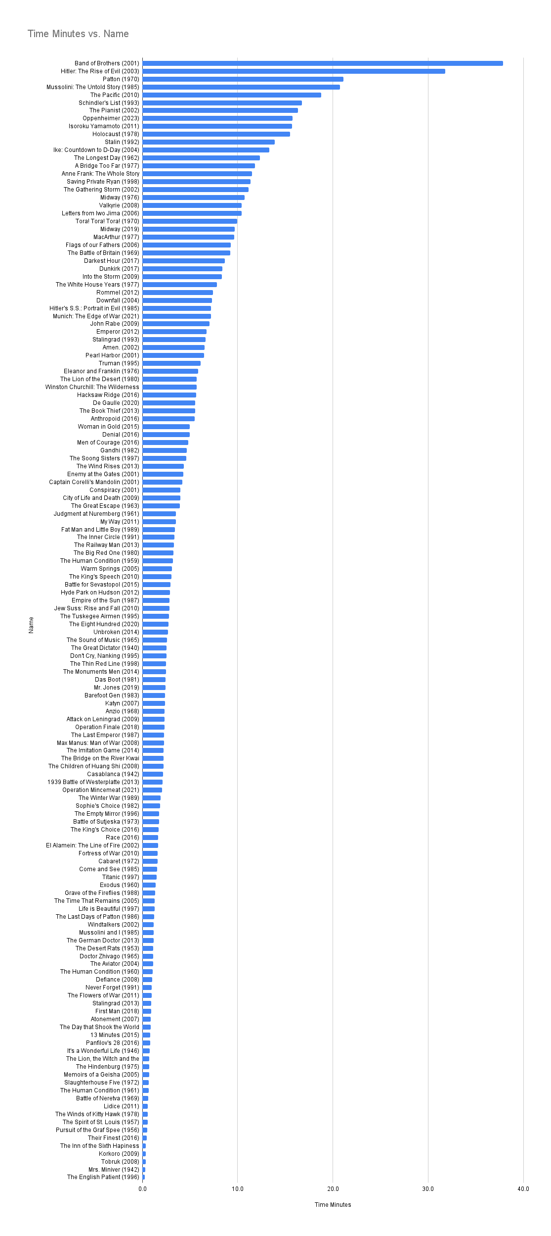 The first step in the process was creating a spreadsheet of World War II movies (available here, for the curious). I started from memory, but quickly needed other sources. Wikipedia has a large list of films, which made a good starting point. ChatGPT is also a good tool if you’re looking for something more specific: