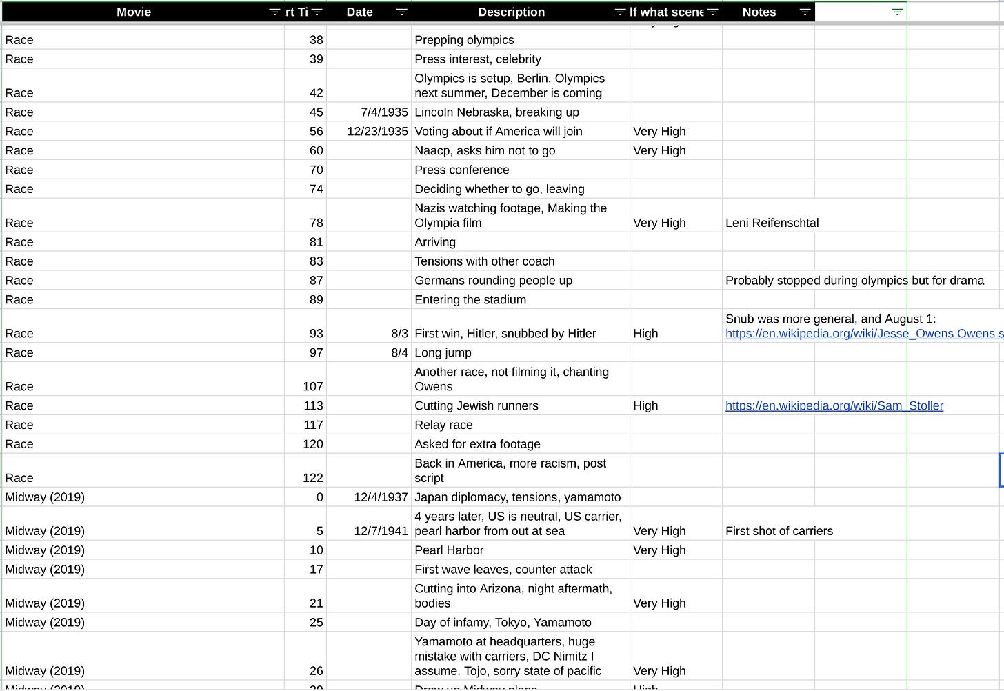 An example of the notes I took on the films Race and Midway (2019). This spreadsheet contains thousands of similar notes