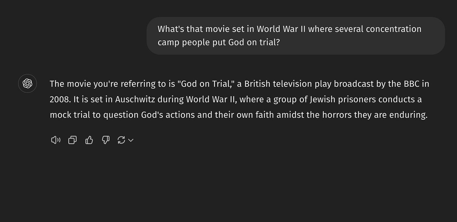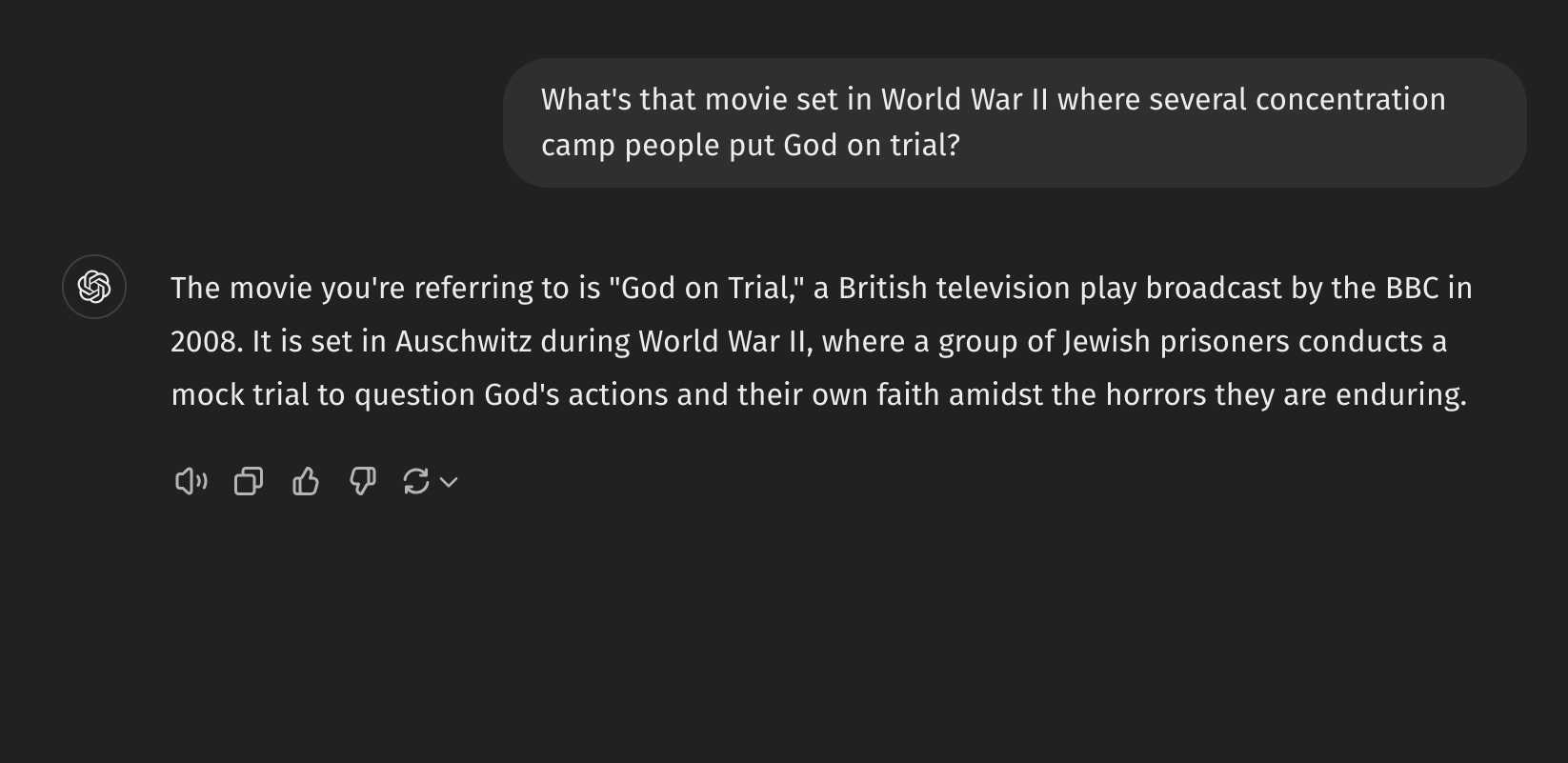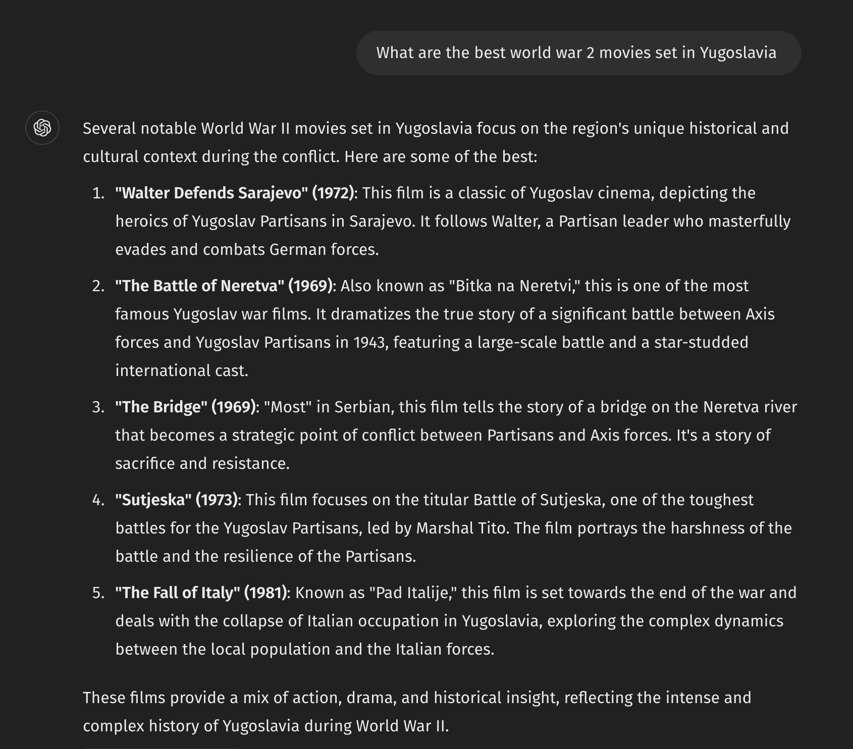 ChatGPT is great at generating lists of ideas, but often misses obvious possibilities, or makes up movies that don’t actually exist