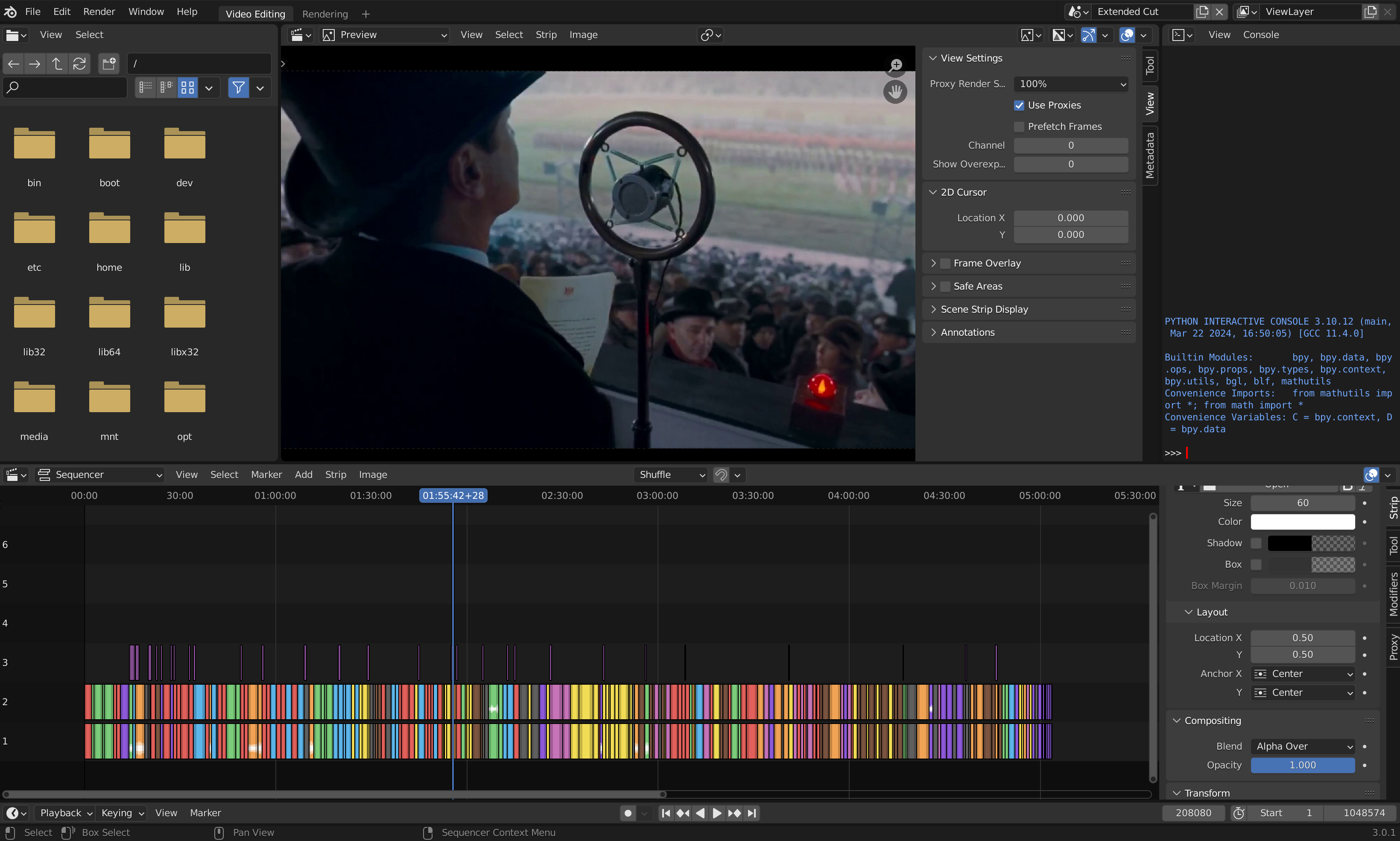 DaVinci Resolve is a widely used, free video editor, and I wanted to give it a try, but unfortunately it kept crashing on my computer. After experimenting with a few other Linux editors, I decided to use the open source 3D modelling tool Blender instead. I’m familiar with Blender from other work, and knew it had a basic video editor. A few tests showed it could handle the requirements, with the added benefit that it’s easily scriptable with Python, so I could automate my workflow and save a lot of time.