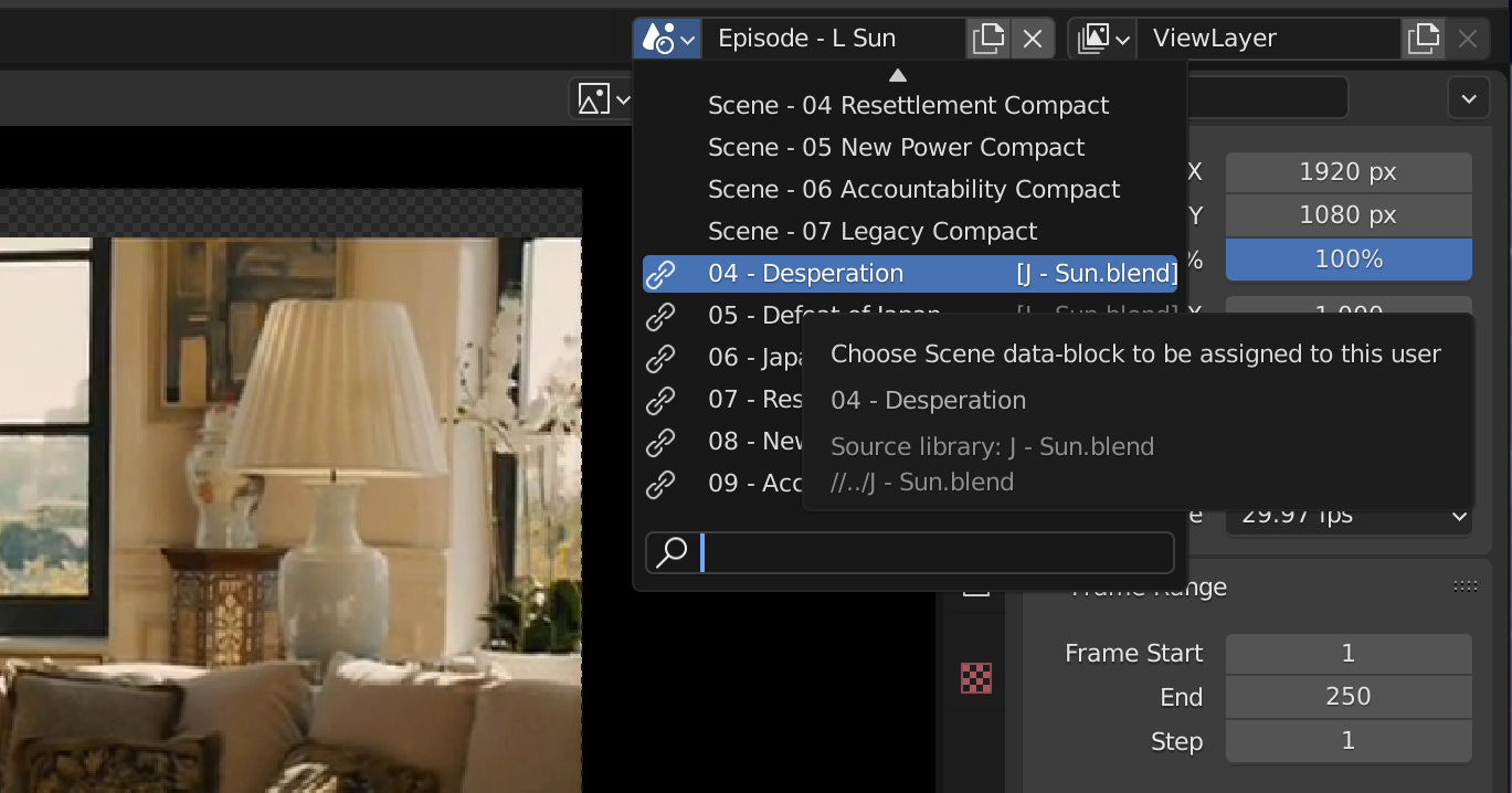 Eventually I started using Blender’s library linking features to import clips. This let me cut the movie into clips in one project, and then import that project into my main file, without having to render individual clips. This saved a lot of time, and improved how quickly I could iterate on which clips to bring in.