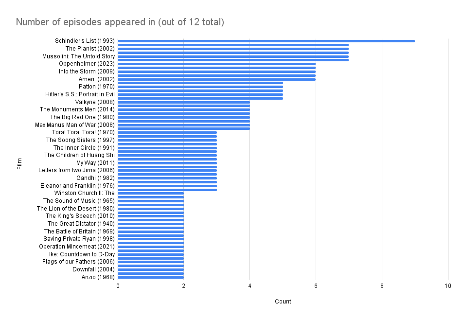 Schindler’s List was used in 8 out of 12 of my final episodes, the most of any movie, showing what a wide time period the film spans. Most of the films were only used for a few scenes, and only appeared in a single episode. Here’s the breakdown for the most used films: